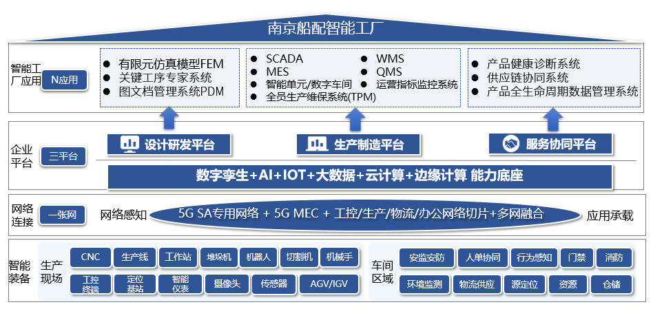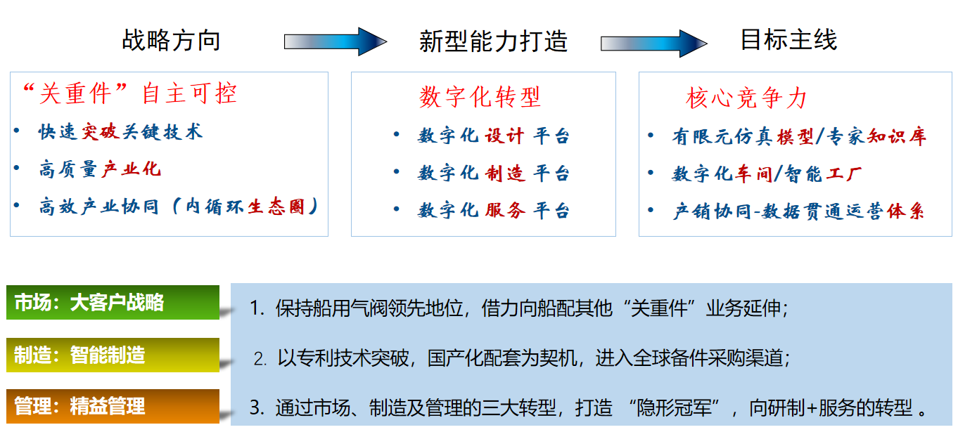 在企業(yè)資源和能力有限的條件下,南京船配聚焦高價(jià)值競爭優(yōu)勢,選擇“企業(yè)戰(zhàn)略目標(biāo)-優(yōu)勢需求-能力打造”目標(biāo)路徑,從業(yè)務(wù)、運(yùn)營、組織、技術(shù)等各個(gè)要素環(huán)節(jié)的數(shù)字化改造著手,圍繞關(guān)鍵技術(shù)突破、高質(zhì)量產(chǎn)業(yè)化、供應(yīng)鏈高效協(xié)同,應(yīng)用5G等新一代信息技術(shù),開展關(guān)鍵工序建模仿真、專家系統(tǒng)建設(shè),搭建數(shù)字化設(shè)計(jì)平臺;開展智能單元/數(shù)字車間建設(shè),搭建數(shù)字化制造平臺;開展產(chǎn)供銷流程信息化,搭建數(shù)字化服務(wù)平臺。全面打造設(shè)計(jì)研發(fā)、生產(chǎn)制造、協(xié)同服務(wù)能力,逐步推進(jìn)產(chǎn)品創(chuàng)新數(shù)字化、生產(chǎn)運(yùn)營智能化、用戶服務(wù)敏捷化、產(chǎn)業(yè)體系生態(tài)化。