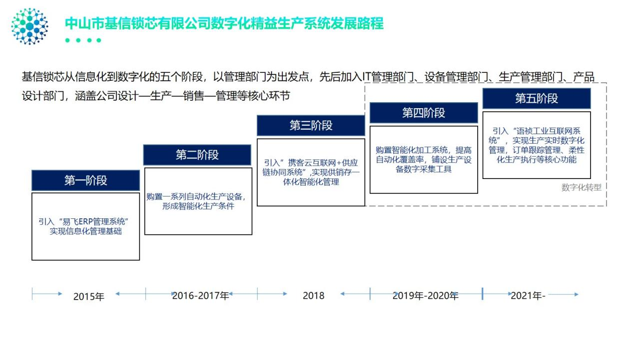 中山市基信鎖芯有限公司數字化精益生產系統,以公司總經辦為主導部門,連同公司管理部門、IT部門、設備部門、生產部門、研發部門等多個部門合作,以公司管理信息化--供銷存一體智能化--生產管理執行數字化為三階段目標,自2015年開始實施,至2021年初步完成數字化改造目標。