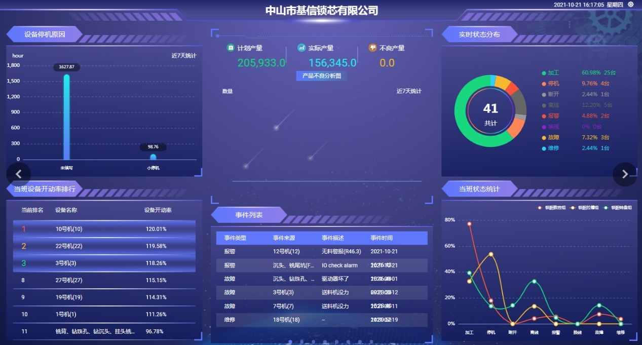 在軟件的實施上,生產管理系統包含了設備狀態監控、DNC、生產執行、ANDON、刀具管理、設備維保等子模塊,結合數據采集終端進行設備聯網與數據采集,結合精益生產的理論基礎,在平臺上進行數據建模、統計與分析,形成科學的生產制造數據分析報表,輔助生產管理者及時處置生產異常,輔助企業管理者快速進行管理決策,助力企業提高制造效率與品質,降低制造成本。