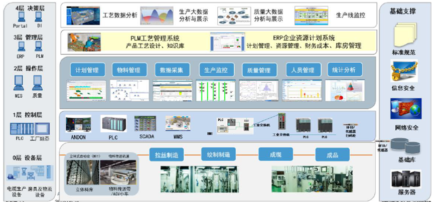 建設數字化工廠是尚緯股份高質量發展戰略的核心內容,是企業走“高端化、差異化、智能化、國際化”戰略發展道路的核心支撐。尚緯股份數字化工廠建設分為基礎設施建設、信息平臺完善、綜合應用創新3個階段,目前已初步完成三個階段的主體計劃,并成功構建設備、控制、操作、管理、決策五層管理,已初步建成電纜行業領先的數字化工廠。