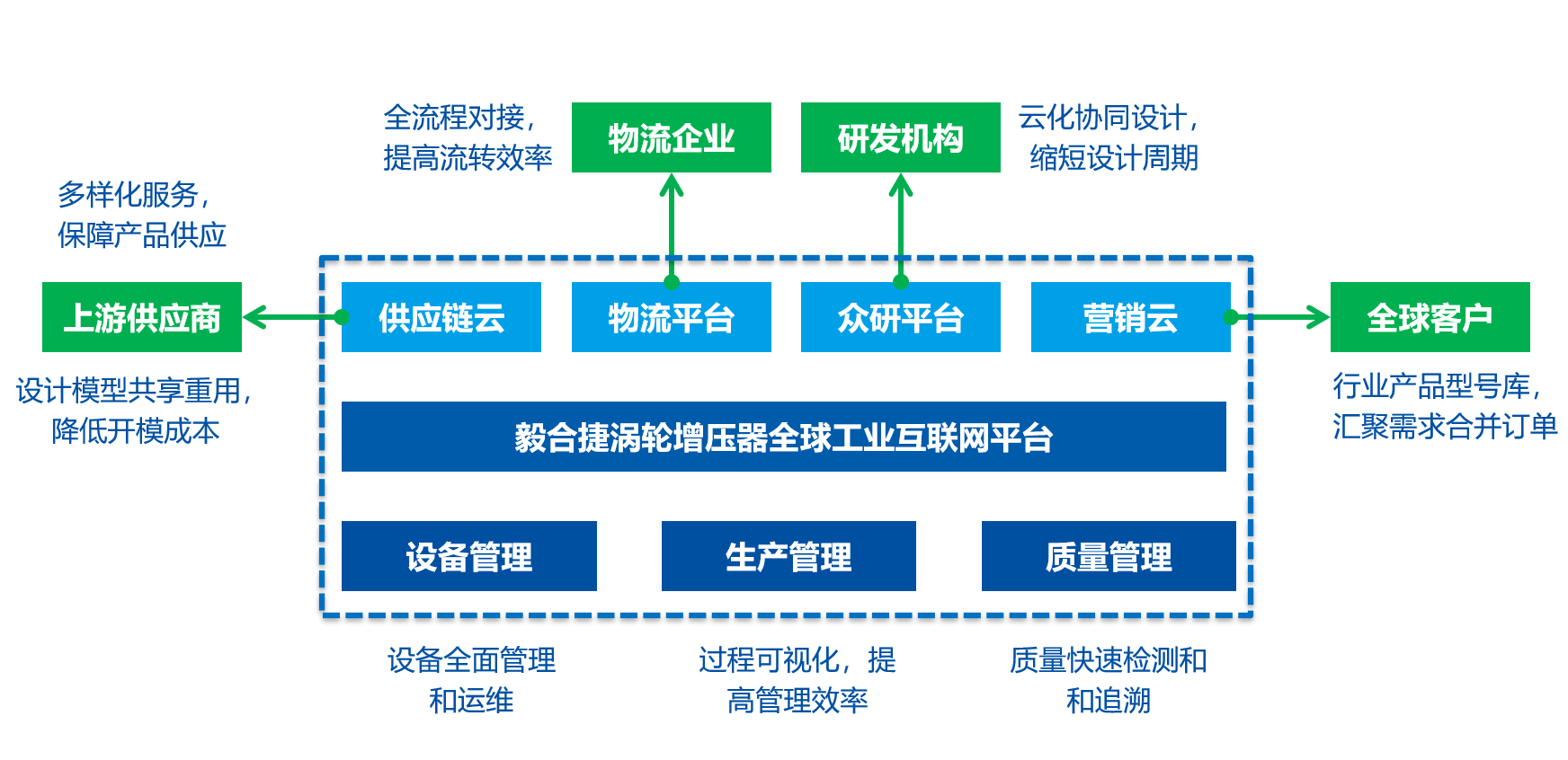 為了滿足渦輪增壓器全球售后市場以及OEM客戶不同定制化需求,著力建設渦輪增壓器全球工業互聯網平臺,打通從產品設計、采購、生產、銷售、物流、服務各環節,實現產業鏈人機物全面互聯。通過供應鏈平臺降低供應鏈成本,物流平臺降低貨物的流轉成本,眾研平臺提高協同效率,設備利用率提高15%,生產效率提高22%,客訴數量降低20%。