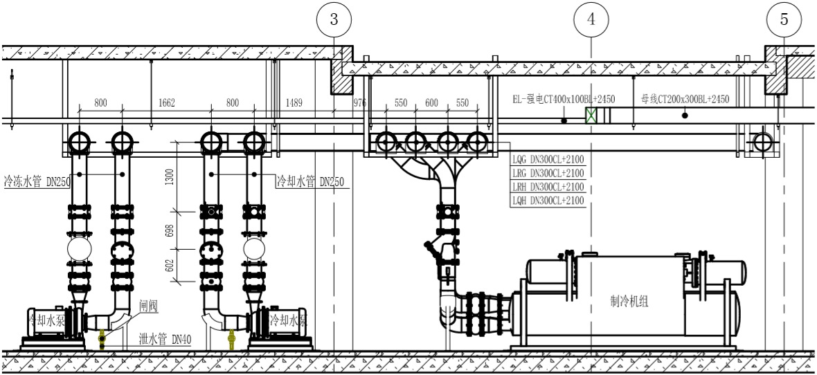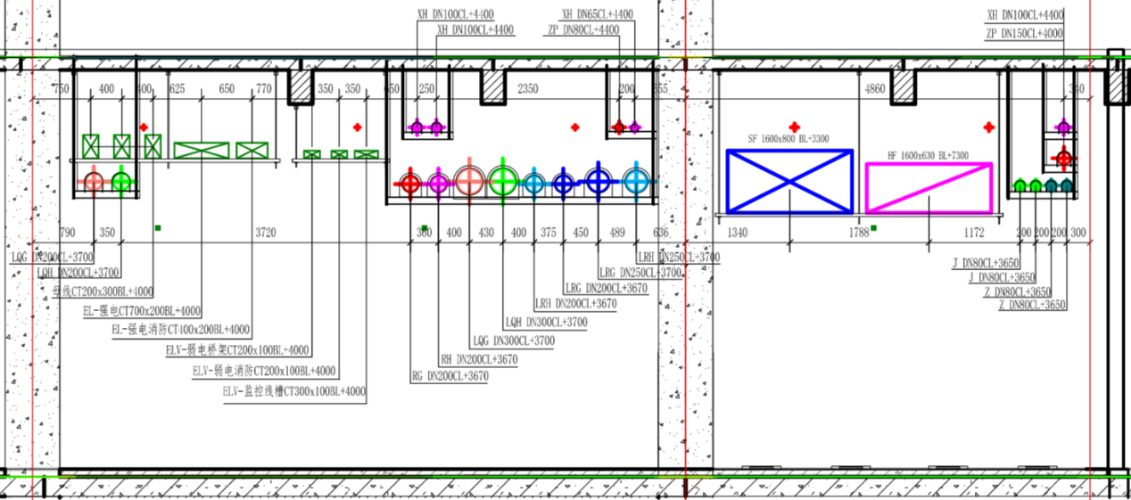 地下室機電管線的特點為,系統(tǒng)復(fù)雜,各各系統(tǒng)的主干管線在本層都有。管線不同系統(tǒng)之間交叉,同一系統(tǒng)之間互相交叉比較嚴(yán)重。局部復(fù)式停車位凈高要求較高,管線只能在車道上方布置。首先對所有的機電管線進行系統(tǒng)的分類,對同一類型路由差不多的管道盡量綜合在一起。我們把給排水的有壓管道綜合在一起,去往不用區(qū)域的橋架分兩排布置,空調(diào)風(fēng)與空調(diào)水同路由綜合在一起,這樣使得在車道上方的管線更加的規(guī)矩合理,避免互相交叉,施工方便。