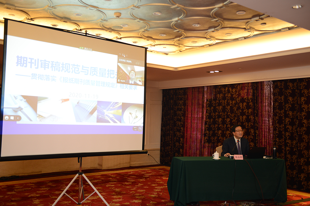 張品純總編就《期刊審稿規范與質量把關要點——貫徹落實<報紙期刊質量管理規定>相關要求》作專題講座。張總編詳細解讀了《報紙期刊質量管理規定》的出臺背景、主要內容、依據的法律法規和標準規范,從封面、版權頁、目次頁、論文內容及編排格式、參考文獻著錄格式、廣告頁等多方面詳細地指出了期刊終審與審讀過程中的質量把關要點,系統歸納和整理了審讀中常見的差錯和問題,以生動豐富的案例說明了期刊出版過程中由于審校不嚴謹、不細致所造成的政治性、事實性差錯及其重大危害。