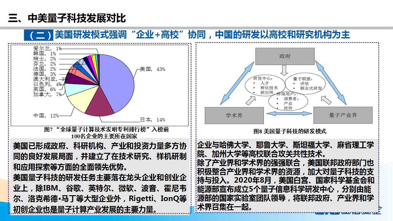 報告從頂層戰略布局、研發資金投入、量子計算實力、專利論文發表等角度,梳理了2020年全球主要國家的量子科技發展態勢,并從技術實力、研發模式、資金投入、人才培養等角度,對比我國與美國的發展差異,并研判我國量子科技發展面臨的風險和機遇,提出推動量子科技發展的對策建議。