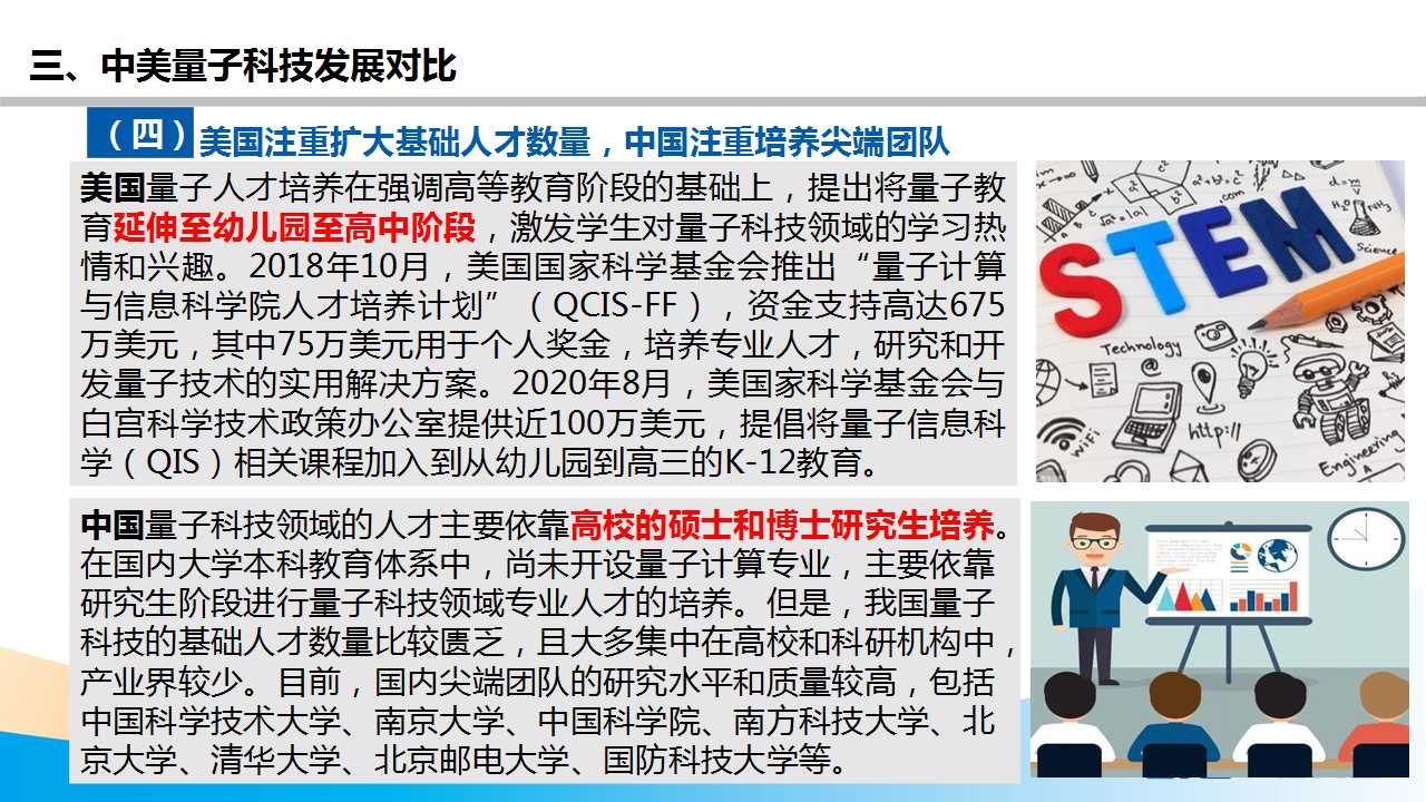 報告認為,我國與美國量子科技發展各有所長:美國在量子計算領域領先,中國在量子通信領域領先;美國研發模式強調“企業+高校”協同,中國的研發以高校和研究機構為主;美國量子投資大多是“政府”+“風投”的雙線聯動,中國仍需帶動風投市場加大投資;美國注重擴大基礎人才數量,中國注重培養尖端團隊。報告指出,中國量子科技發展仍面臨量子計算核心技術較落后、量子通信產業鏈上下游實力不均、量子科技人才數量不足等風險,亟須加強頂層設計和國家統籌,提高對量子科技發展的跟蹤與研究,加快基礎研究和關鍵核心技術的攻關,打造產學研用協同創新網絡,培養量子科技領域的基礎人才和尖端團隊。