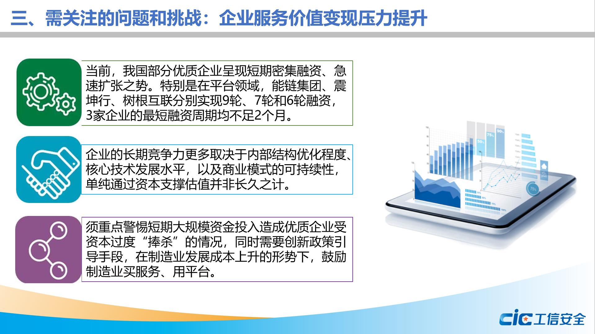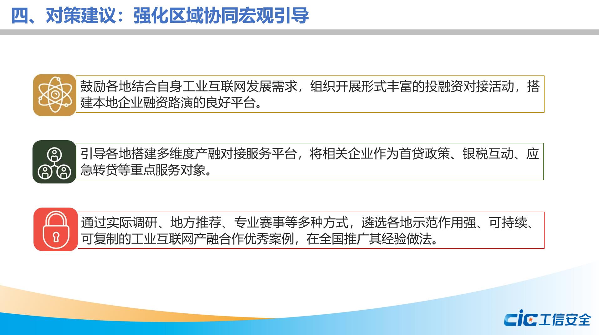 報告強調,當前我國工業互聯網產融合作也面臨著企業服務價值變現壓力提升、中小企業升級改造難度較大、區域產融合作發展差距明顯等問題應引起重視。未來應進一步強化企業信用體系建設,創新產融合作業務模式。以政府引導基金等為紐帶,帶動各路資本投早投小。同時,還應加快搭建數字化轉型公共服務體系,完善中小企業幫扶機制。此外,可通過組織開展投融資對接活動、產融合作專業賽事等方式,強化區域協同宏觀引導,打造產業與金融良性互動、共生共榮的發展局面。