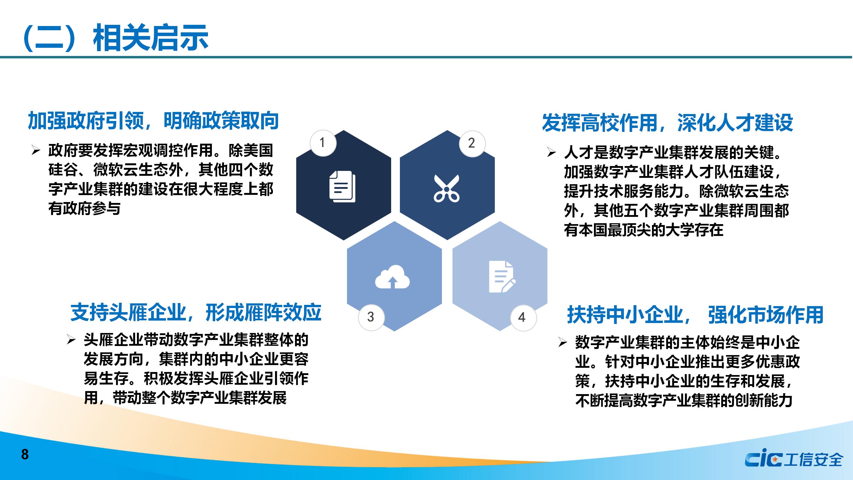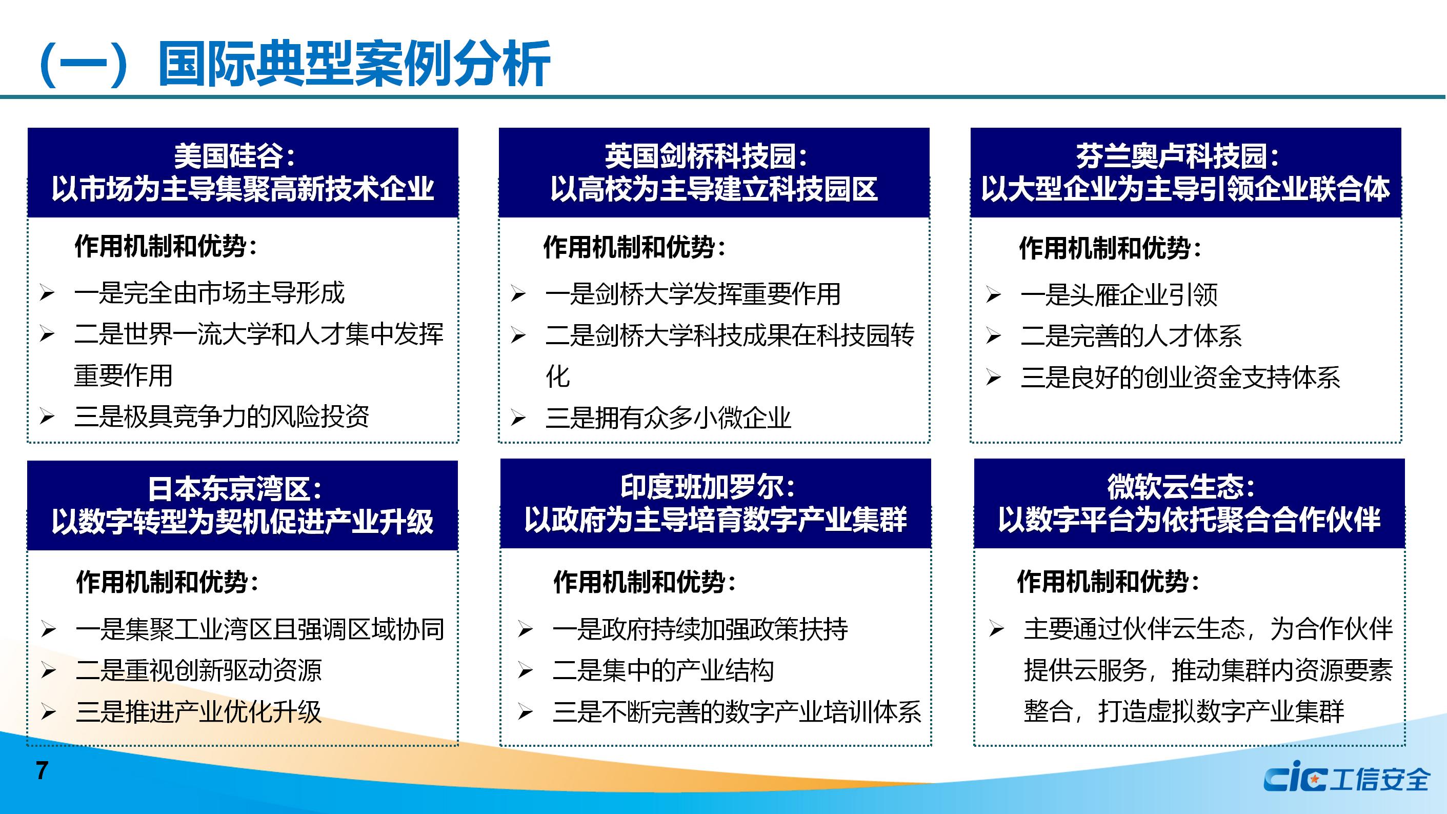 通過對美國硅谷、英國劍橋科技園、芬蘭奧盧科技園、日本東京灣區、印度班加羅爾、微軟云生態六類國際數字產業集群的研究分析,總結得出四大啟示:一是加強政府引領,明確政策取向;二是發揮高校作用,深化人才建設;三是支持頭雁企業,形成雁陣效應;四是扶持中小企業,強化市場作用。
