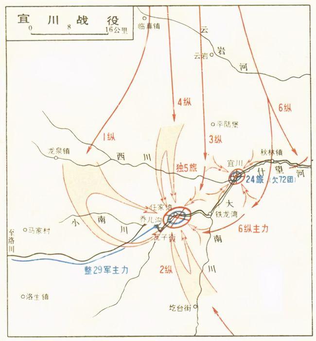 按此計劃,我軍第三、第六縱隊于2月24日包圍宜川城并發起攻擊。同時,第一、第四縱隊在宜川西南的瓦子街地區隱蔽集結,待機打援。宜川被圍后,守敵嚇得慌了手腳,頻頻向胡宗南電告求援。胡宗南主觀成性,驕橫輕敵。他認為我軍兵力不過4個縱隊,其中一個縱隊被牽制在黃河以東不能參戰,必定無力打援。若他以主力部隊直驅宜川,會使我軍措手不及,達到內外夾擊之效。于是,胡宗南急令劉戡率整編第二十九軍輕裝出發,沿洛宜公路,取道瓦子街馳援宜川。